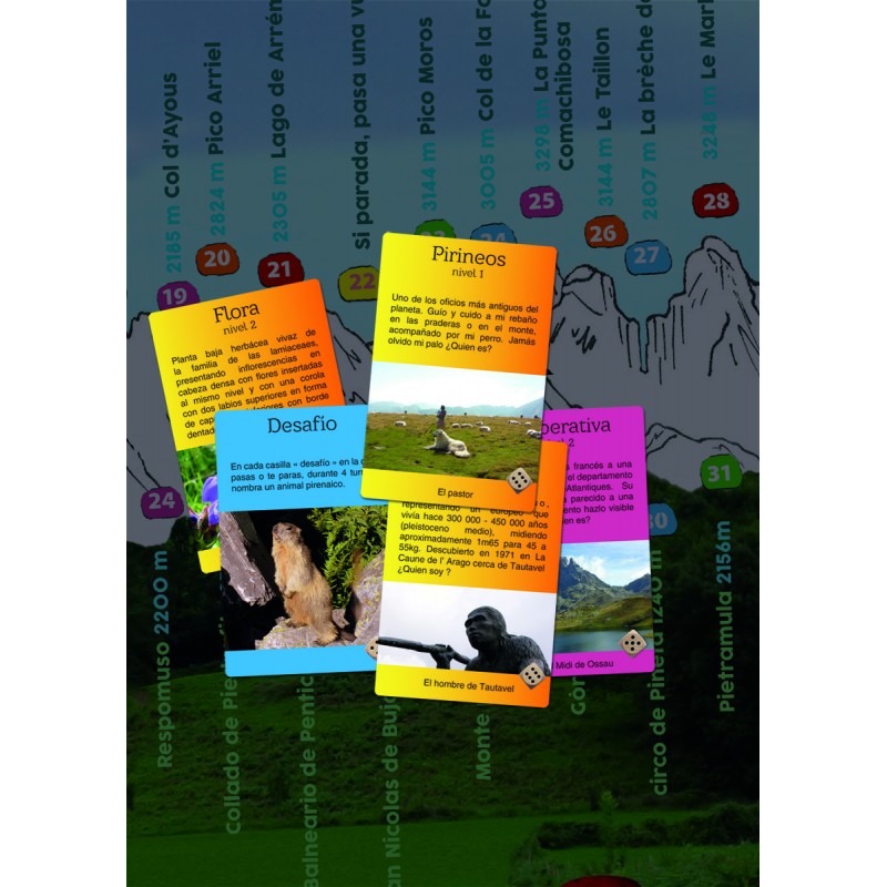 Mientras que los más conocedores están trabajando en el nivel 2, los novatos probáron el nivel 1 con o sin las indicacónes entre parentésis y/o la illustraciones. Los más pequeños encontraron la fauna y la flora pirenaica, con las cartas, o buscaron imagen en la bandeja con las cartas con un pictograma montaña. A cada buena respuesta el jugador avanza de una casilla, si mala respuesta el retrocede de una casilla, pues el torno es al jugador a la izquierda.